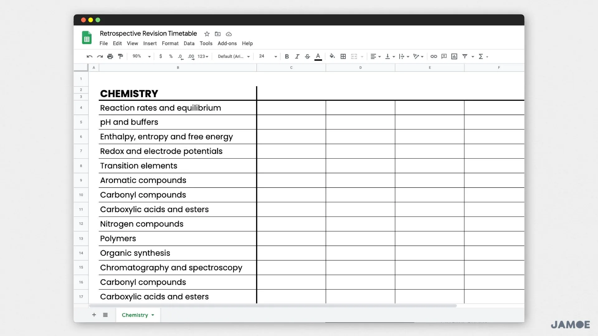 - List all the sub-topics for that subject, e.g. for Chemistry you could add Atomic Structure, Thermodynamics, Acids and Bases, etc.