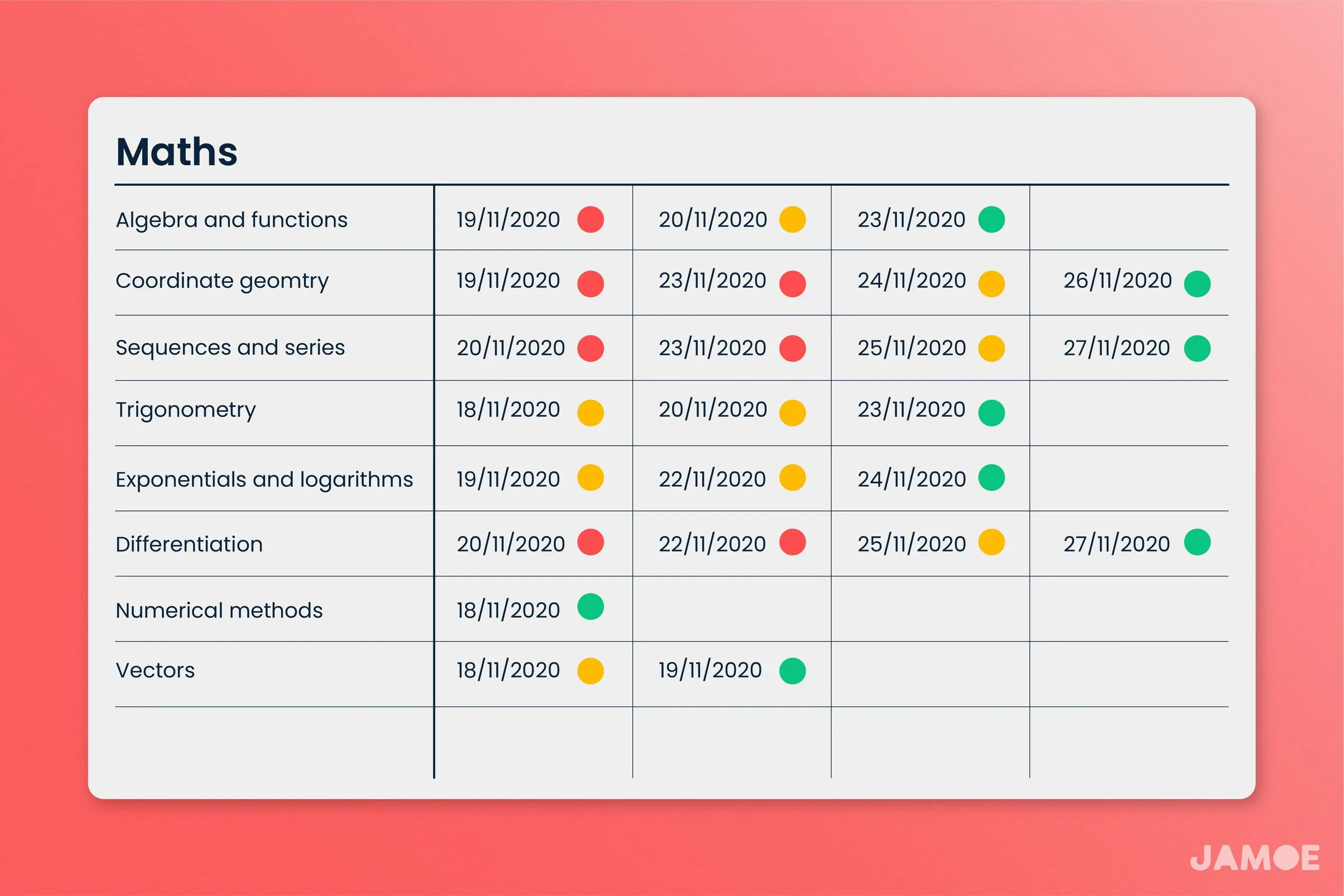 - Add whether your understanding of the topic was high, medium, or low using green, yellow, and red, respectively. These colours are a quick visual breakdown of your comprehension and confidence